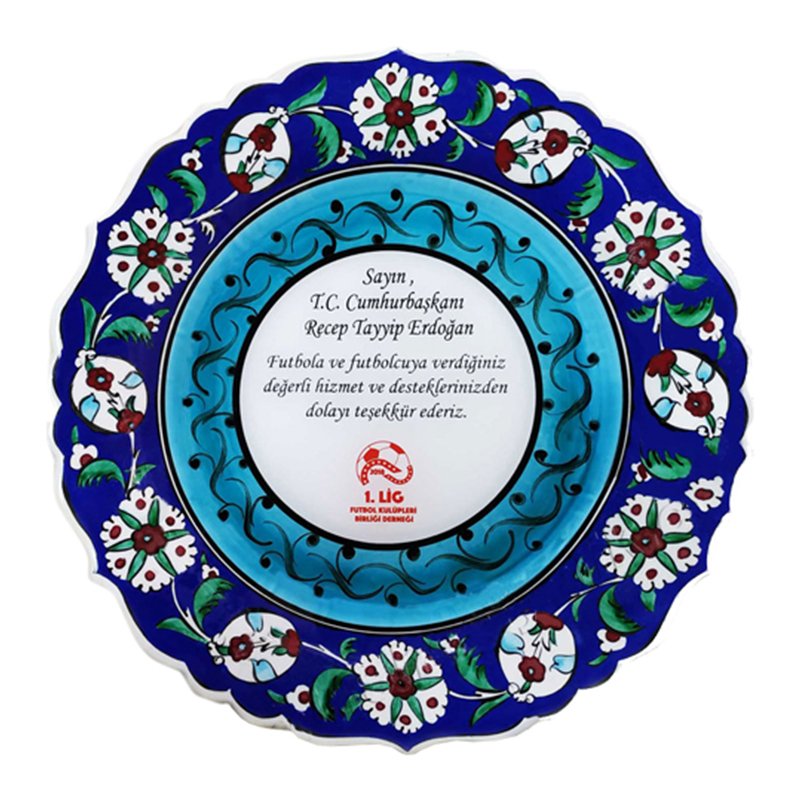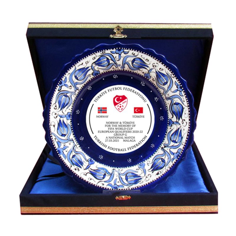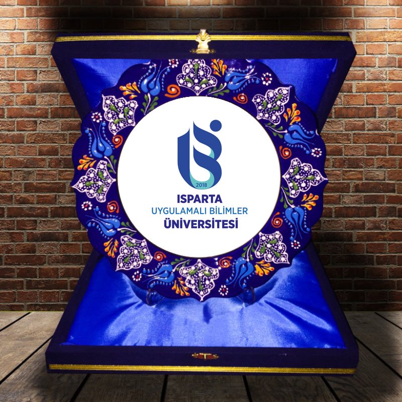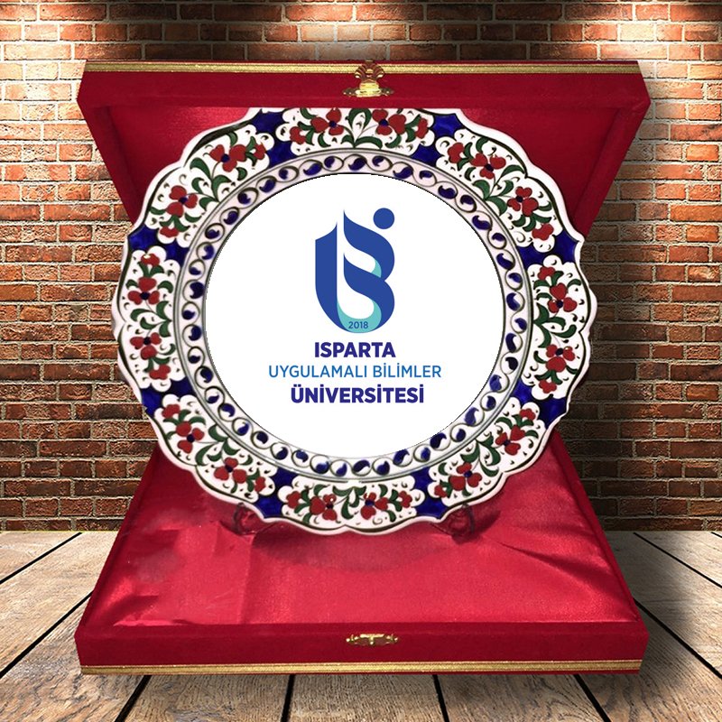 Kadife Kutulu kurumsal hediye olarak üniversitelere ve benzeri resmi kurumlara özel olarak logolu hazırlanan çini tabak ürününün çapı 25 cm’dir.