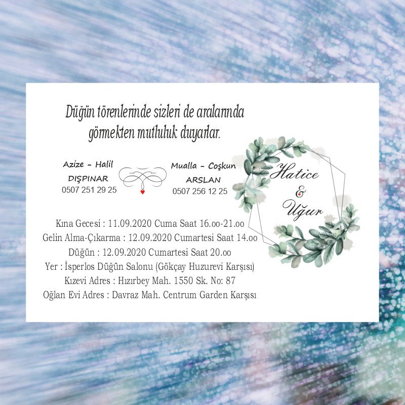 • Davetiyelerin sitede yer alan görselleri sizin kullanmakta olduğunuz bilgisayar ekran çözünürlüğüne göre farklılık gösterebilmektedir. Buna bağlı olarak nihai ürün ile ekranda gördüğünüz ürün arasında ton farklılıkları yaşanabilmektedir.
