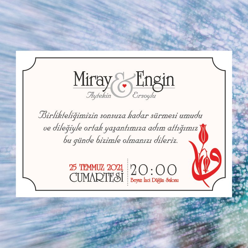 • Davetiyelerin sitede yer alan görselleri sizin kullanmakta olduğunuz bilgisayar ekran çözünürlüğüne göre farklılık gösterebilmektedir. Buna bağlı olarak nihai ürün ile ekranda gördüğünüz ürün arasında ton farklılıkları yaşanabilmektedir.