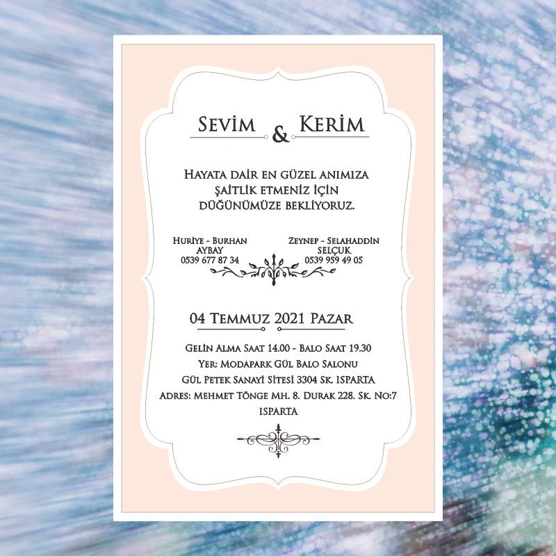 • Davetiyelerin sitede yer alan görselleri sizin kullanmakta olduğunuz bilgisayar ekran çözünürlüğüne göre farklılık gösterebilmektedir. Buna bağlı olarak nihai ürün ile ekranda gördüğünüz ürün arasında ton farklılıkları yaşanabilmektedir.