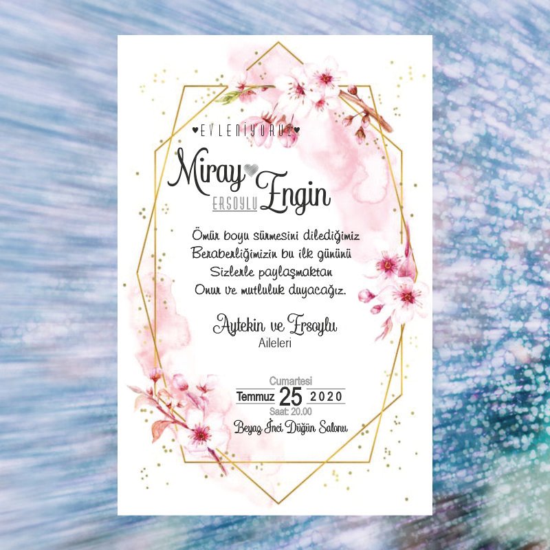 • Davetiyelerin sitede yer alan görselleri sizin kullanmakta olduğunuz bilgisayar ekran çözünürlüğüne göre farklılık gösterebilmektedir. Buna bağlı olarak nihai ürün ile ekranda gördüğünüz ürün arasında ton farklılıkları yaşanabilmektedir.
