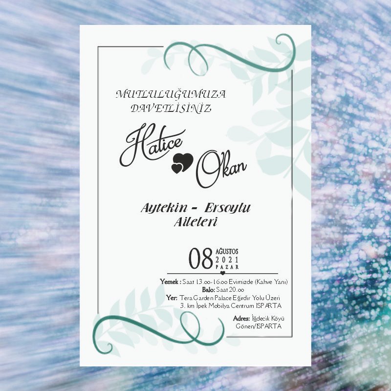 • Davetiyelerin sitede yer alan görselleri sizin kullanmakta olduğunuz bilgisayar ekran çözünürlüğüne göre farklılık gösterebilmektedir. Buna bağlı olarak nihai ürün ile ekranda gördüğünüz ürün arasında ton farklılıkları yaşanabilmektedir.