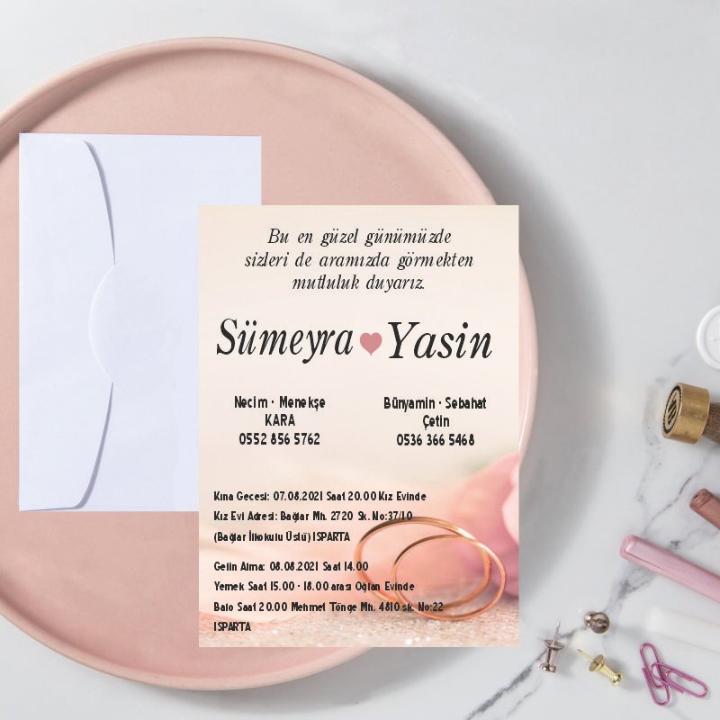 • Davetiye ebatı 10,5 cm x 15,5 cm’dir. Davetiye zarfsızdır.