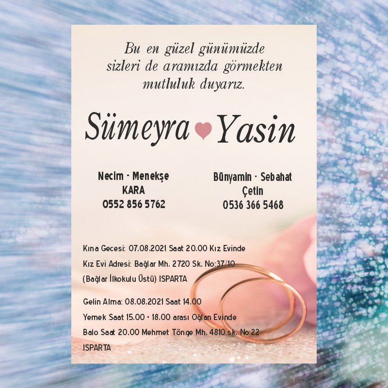 • Davetiyelerin sitede yer alan görselleri sizin kullanmakta olduğunuz bilgisayar ekran çözünürlüğüne göre farklılık gösterebilmektedir. Buna bağlı olarak nihai ürün ile ekranda gördüğünüz ürün arasında ton farklılıkları yaşanabilmektedir.