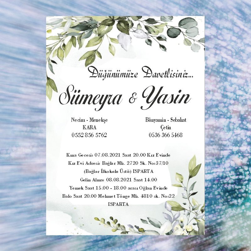 • Davetiyelerin sitede yer alan görselleri sizin kullanmakta olduğunuz bilgisayar ekran çözünürlüğüne göre farklılık gösterebilmektedir. Buna bağlı olarak nihai ürün ile ekranda gördüğünüz ürün arasında ton farklılıkları yaşanabilmektedir.