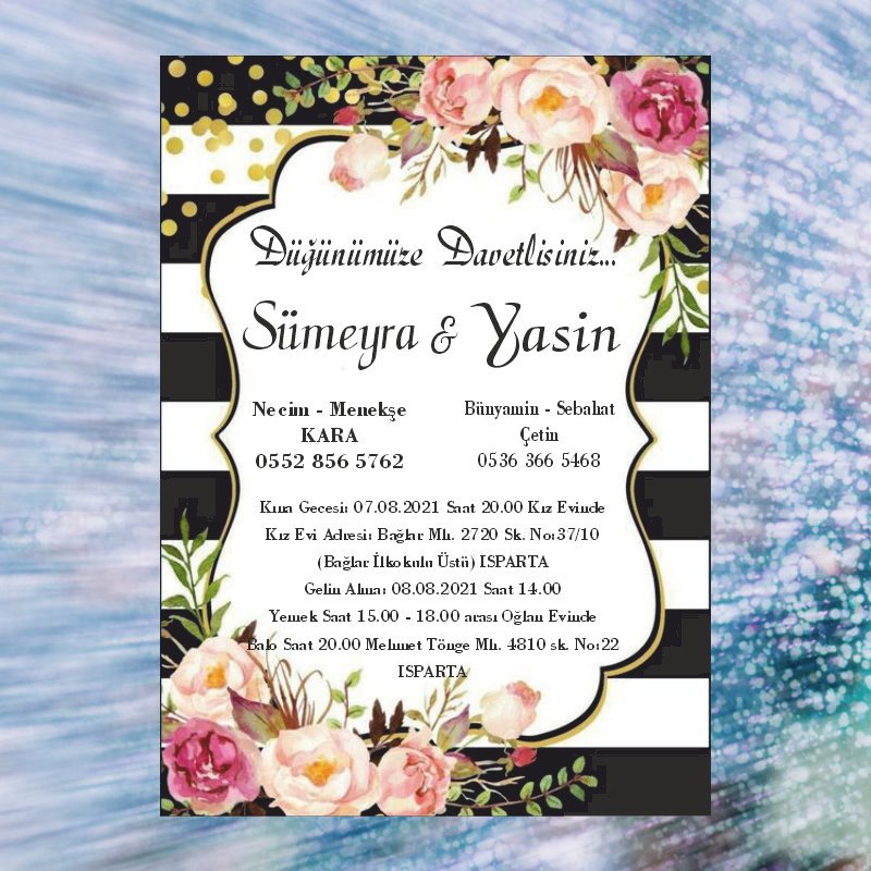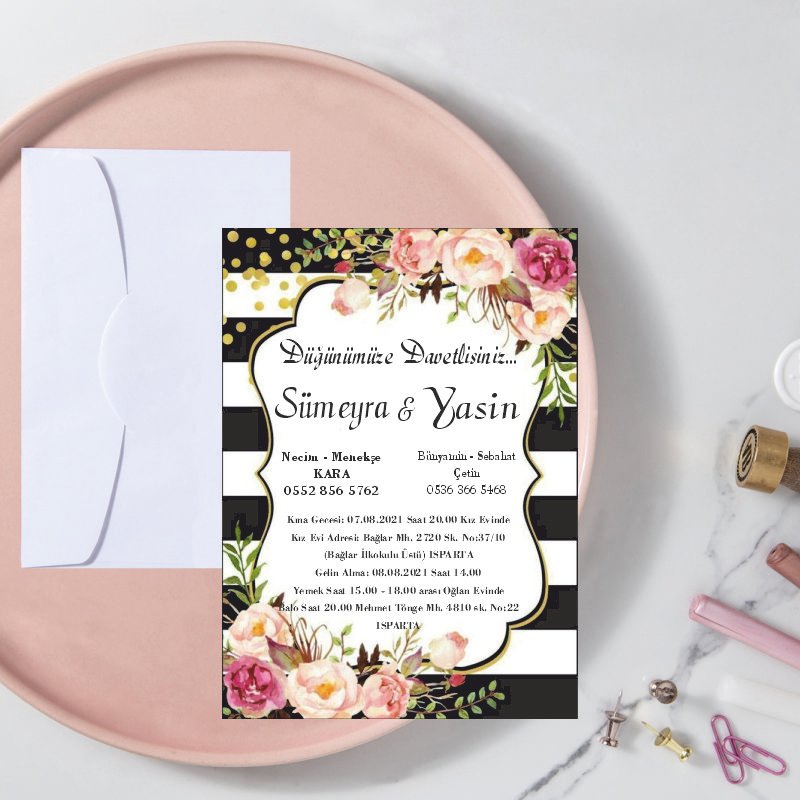 • Davetiye ebatı 10,5 cm x 15,5 cm’dir. Davetiye zarfsızdır.
