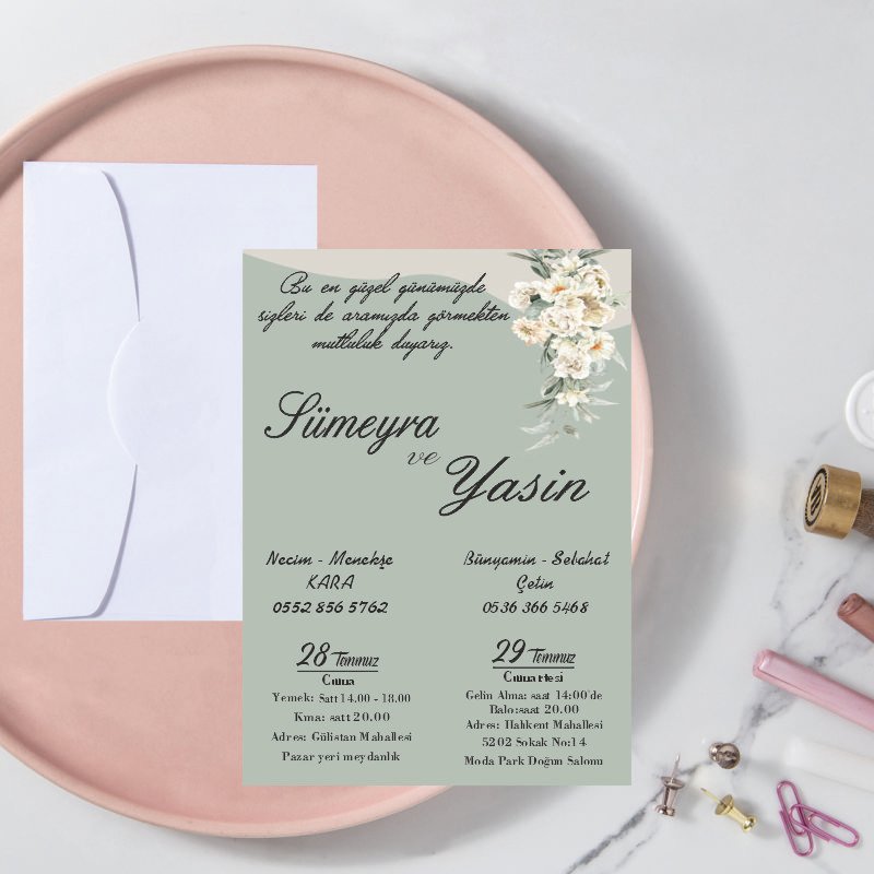 • Davetiye ebatı 10,5 cm x 15,5 cm’dir. Davetiye zarfsızdır.