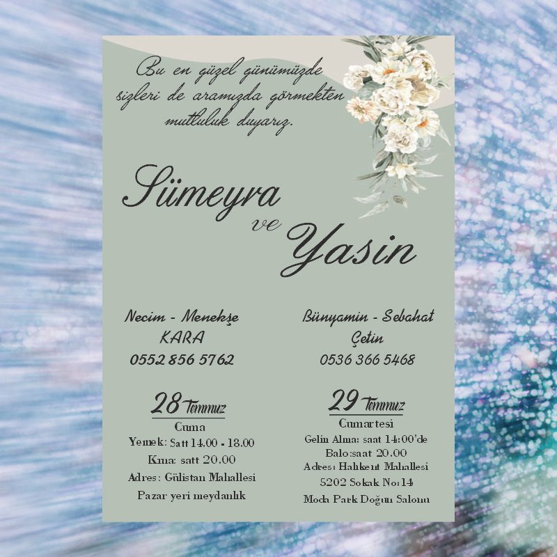 • Davetiyelerin sitede yer alan görselleri sizin kullanmakta olduğunuz bilgisayar ekran çözünürlüğüne göre farklılık gösterebilmektedir. Buna bağlı olarak nihai ürün ile ekranda gördüğünüz ürün arasında ton farklılıkları yaşanabilmektedir.