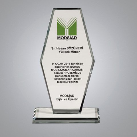 Plaketin üstüne istediğiniz yazı, logo veya resim basımı yapılabilir.